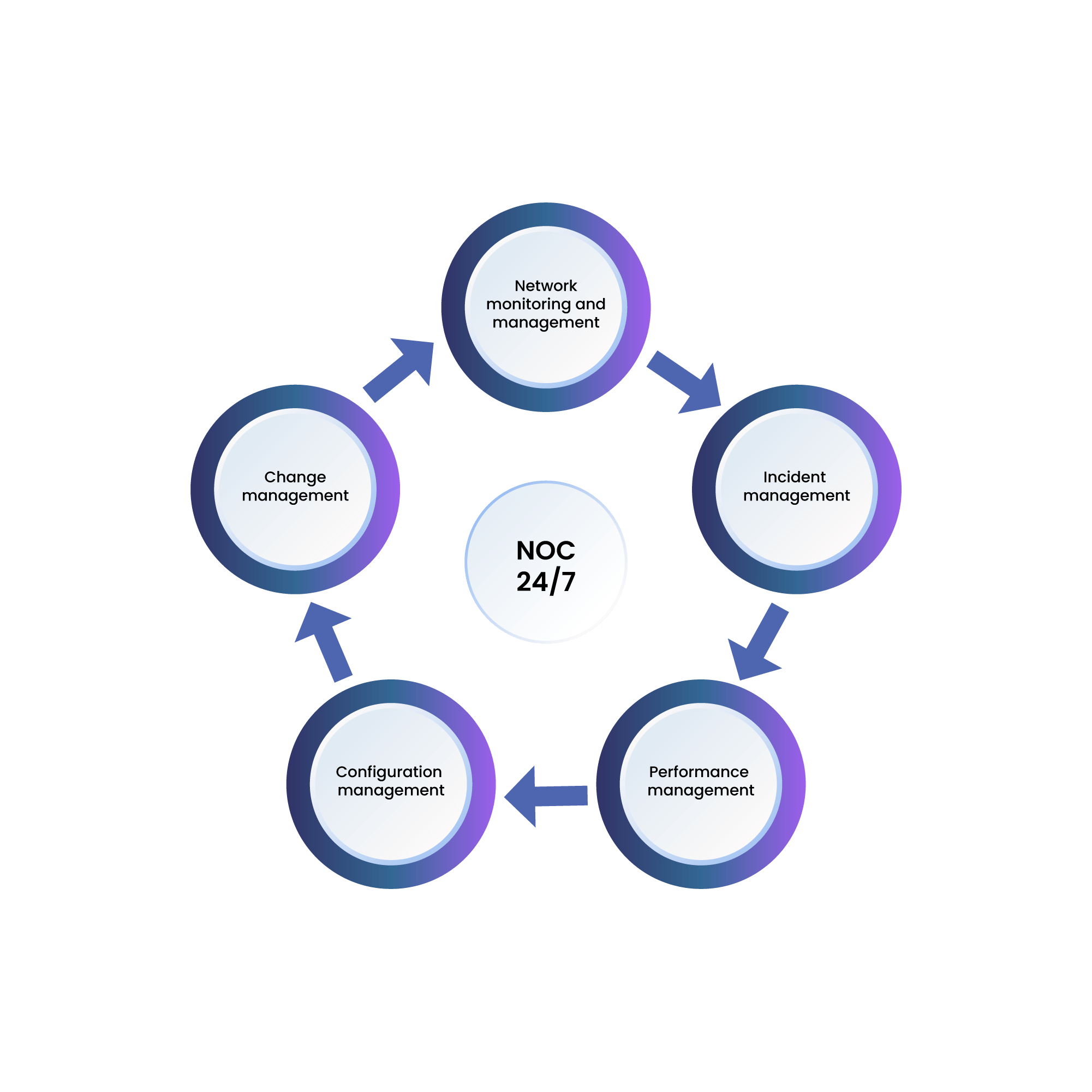 The key functions of a NOC include: Network monitoring and management, Incident management, Performance management, Configuration management, Change management to name a few.